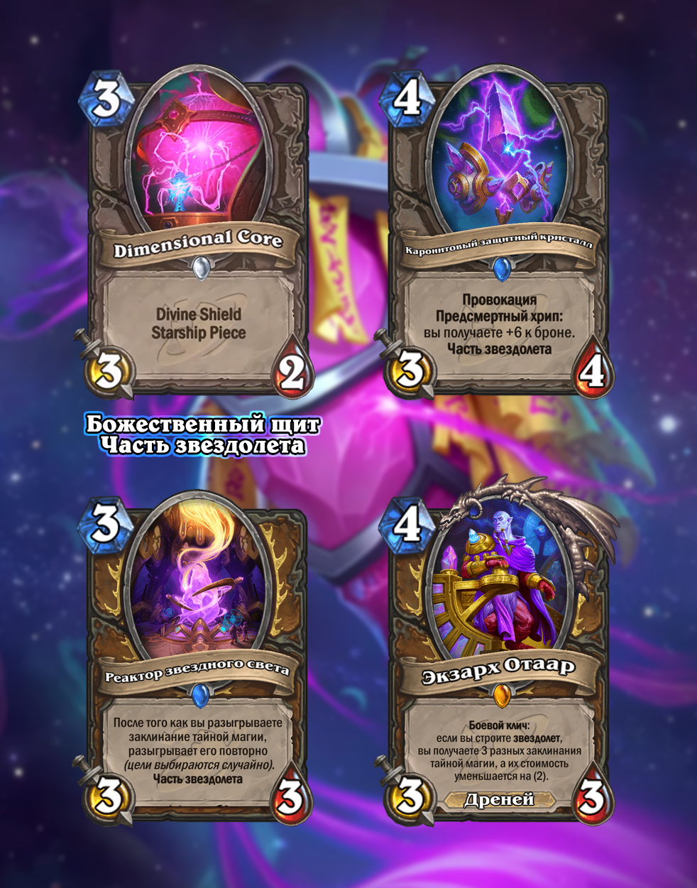 Лучше всего покорять просторы Великой Запредельной Тьмы на красивом новом звездолете! Эти корабли — настоящие шедевры инженерного и магического искусства, питаемые силой разумных существ, сотканных из чистой энергии. Ищите в Великой Запредельной Тьме части звездолетов и разыгрывайте их как обычных существ. Когда части звездолета погибают, корабль получает их характеристики и эффекты. Как будете готовы, нажмите на кнопку «Пуск» и выведите звездолет прямиком на игровое поле!