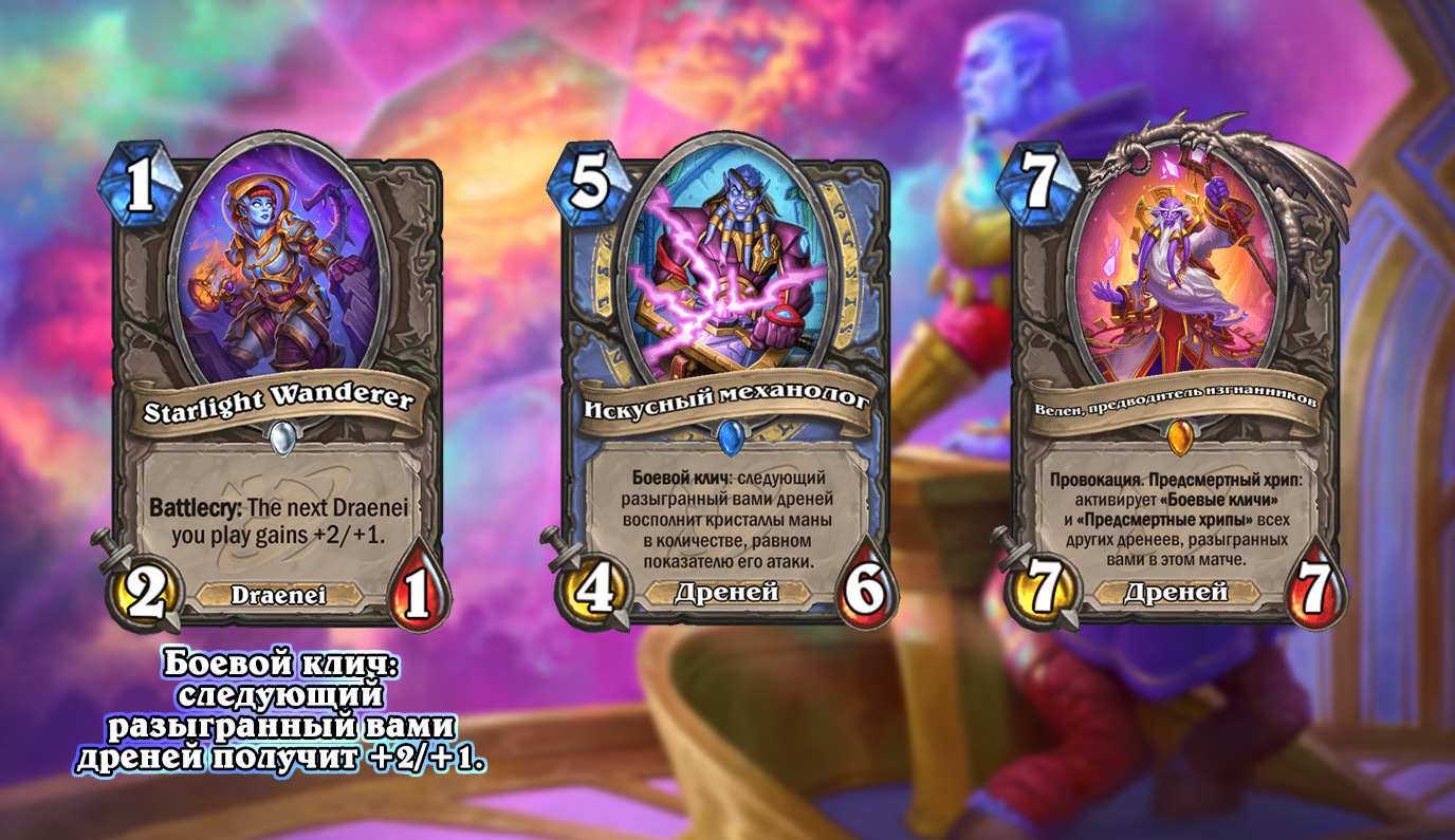 Когда над их миром нависла угроза Пылающего Легиона, дренеи не поддались тлетворному влиянию демонов и отправились к звездам. Теперь их можно встретить в самых разных уголках Великой Запредельной Тьмы, где они ищут новый дом. Помогите этим существам нового типа, добавленного в Hearthstone на постоянной основе, найти место в вашей коллекции. Дренеи — мудрая раса, строящая далеко идущие планы, поэтому многие из них обладают эффектами, которые действуют на следующих разыгранных вами дренеев. Их предводитель — могущественный Велен, воплощающий все добродетели своего народа!