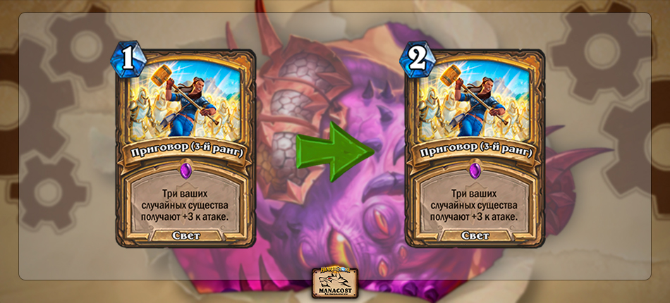• До изменений: «Злопасность» [Стоимость: 1] Ваш следующий «Боевой клич» на этом ходу срабатывает дважды. → После: «Злопасность» [Стоимость: 0] Вы кладете в руку дрожастика 1/1, который повторяет все боевые кличи разыгранных вами карт. (Два раза в матч).