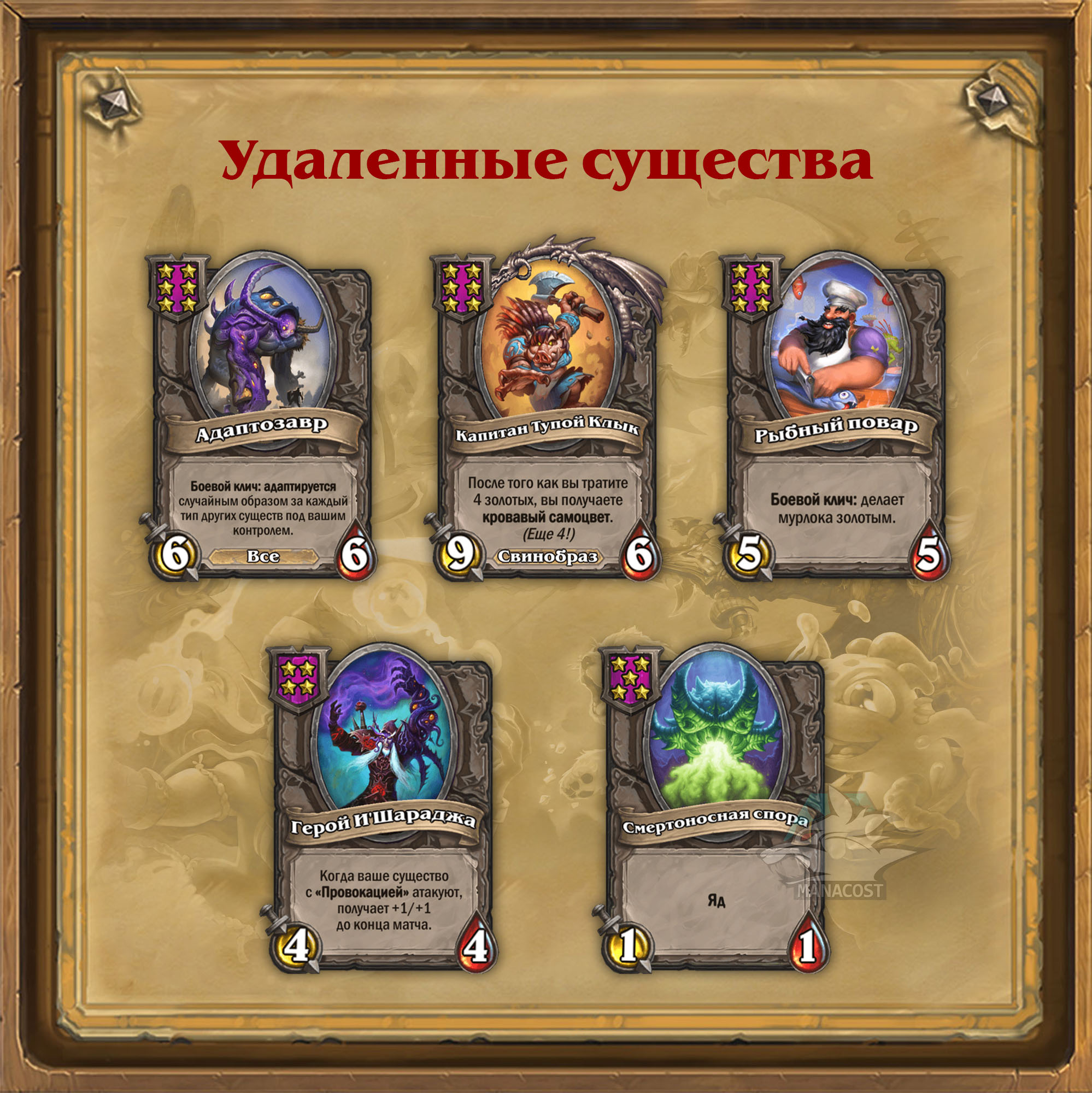 Комментарий разработчиков: Адаптозавр был веселым существом, но со временем его присутствие привело к часто встречающимся одинаковым столам у игроков. Адаптозавр преследовал 3 цели в дизайне: гибкое существо для разных рас, развитие стратегии зверинца и шанс вернуться в игру против оппонентов, которые быстрее наращивают характеристики, чем вы. В новом обновлении эти роли разделены между разными существами: Кошмарным слиянием, Mantid Queen и Leeroy the Reckless. Это изменение отражает наш обновленный принцип дизайна Полей сражений: когда мы будем вводить новый тип существ или большую механику, мы планируем вносить правки и в текущий пул существ, чтобы сохранять игру свежей вне зависимости от того, как вы играете.