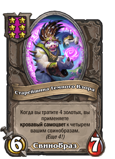[6-й уровень таверны, свинобраз] 6/7. Когда вы тратите 4 золотых, вы применяет кровавый самоцвет к четырем вашим свинобразам.
