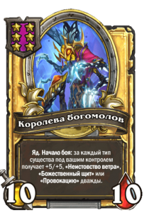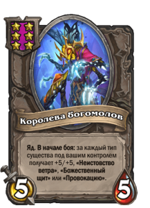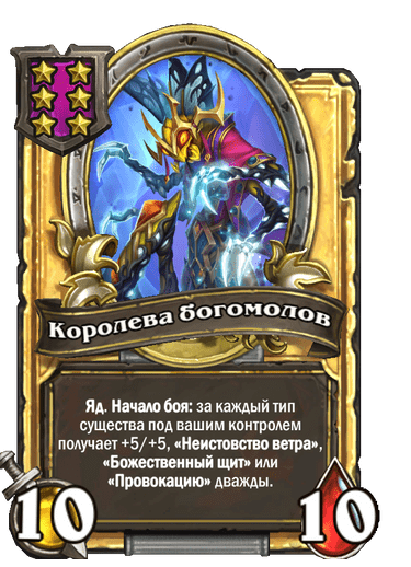 [6-й уровень таверны] 5/5. Яд. В начале боя: за каждый тип существ под вашим контролем получает +5/+5, «Неистовство ветра», «Божественный щит» или «Провокацию».