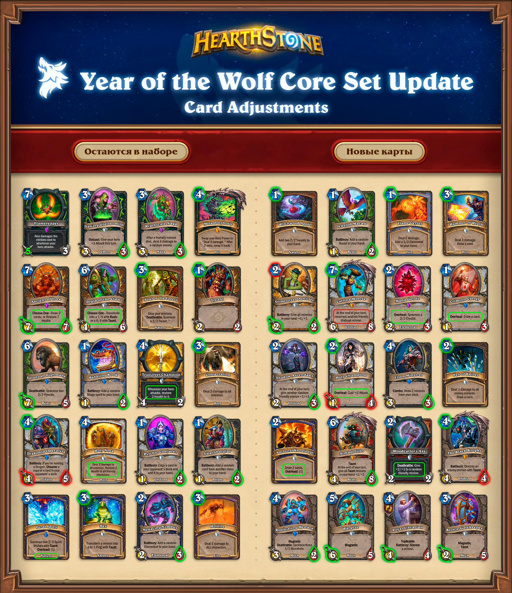 Карты, которые были изменены для Основного набора, поменяют свой вид 4 апреля, вместе с выходом обновления 26.0. Изменение состава Основного набора (замена карт на новые) состоится вместе с началом нового года и выходом «Фестиваля легенд» 11 апреля!