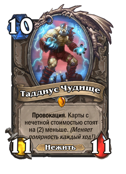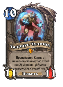 Комментарий разработчиков: Мы не считаем, что комбо стратегии по умолчанию негативно сказываются на игре, и Таддиус Чудище не выбивается по силе на данный момент, однако он долгое время был в Стандарте и продвинул несколько колод, которые очень рано убивают оппонента за один ход и не дают возможности на отыгрыш. Мы решили внести еще одно изменение в Таддиуса и взглянуть, как он поведет себя, став значительно слабее.