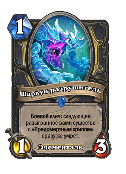 - До изменения: Боевой клич: следующее ваше существо с «Предсмертным хрипом» стоит на (1) меньше, но умирает сразу после того, как вы его разыгрываете.