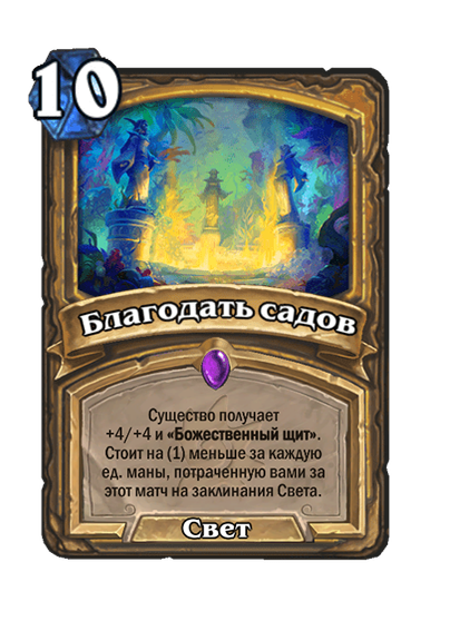 Комментарий разработчиков: Паладин силен после выхода мини-набора. На танцпол — карта, которая встречалась во всех колодах Паладина с момента своего появления, поэтому мы слегка замедляем ее, но в качестве компенсации изменяем свойство «Финал». Также была затронута Благодать садов, чтобы снизить взрывной потенциал Паладина из руки. В этом вопросе под наблюдением находится и Добыча грибов, но нам нравится, что игроки экспериментируют с новыми картами, поэтому пока мы остановимся на этом и внесем необходимые правки позднее при необходимости.
