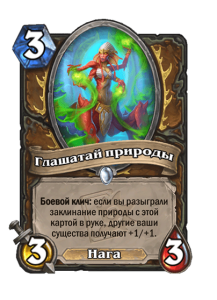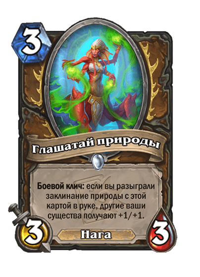 - После: Боевой клич: если вы разыграли заклинание природы с этой картой в руке, другие ваши существа получают +1/+1.