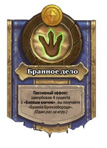 • Пассивный эффект: завербовав 4 существ с «Боевым кличем», вы получаете «Бранна Бронзоборода». (Один раз за игру.)
