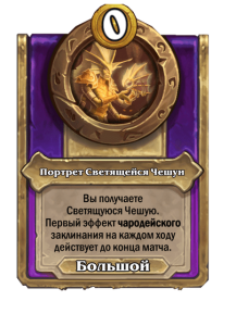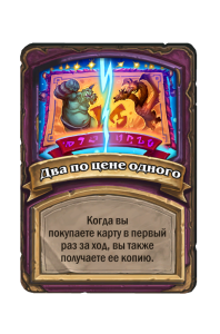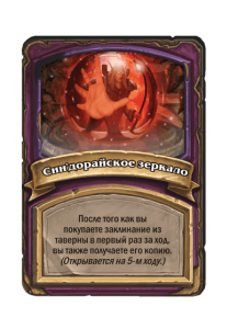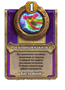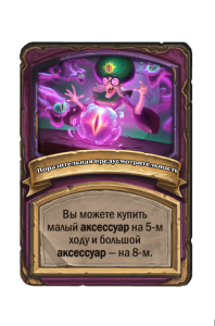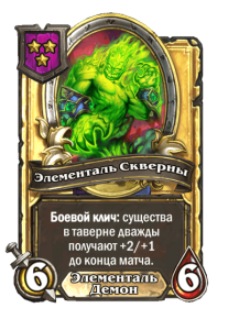 - До изменения: 5 атаки, 6 здоровья. Когда вы применяете заклинание из таверны, одно ваше существо каждого типа получает +2/+1.