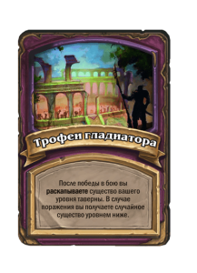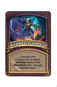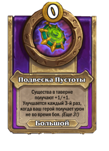 - До изменения: Существа в таверне получают +1/+1. Улучшается каждый 4-й раз, когда ваш герой получает урон не во время боя. (Еще 4!)
