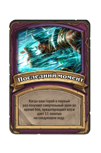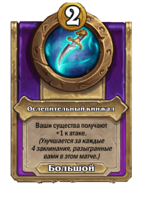 - После: Боевой клич: снаряжает вас кинжалом 1/3. (+1 к атаке за каждую другую карту, разыгранную вами на этом ходу, но не более 10!)