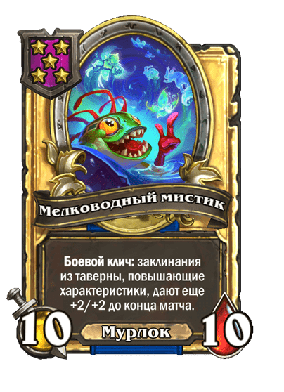 - После: 4 атаки, 4 здоровья. Пока эта карта у вас в руке, получает +4/+4, после того как вы разыгрываете мурлока.