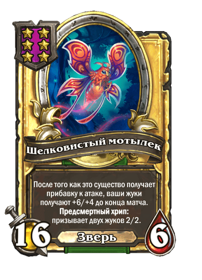 - После: 8 атаки, 3 здоровья. После того как это существо получает прибавку к атаке, ваши жуки получают +3/+2 до конца матча. Предсмертный хрип: призывает жука 2/2.