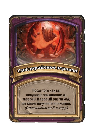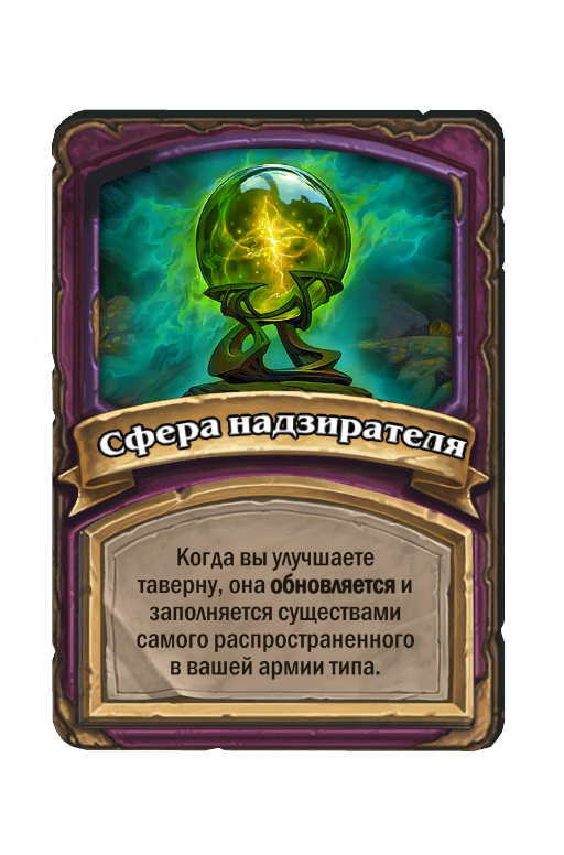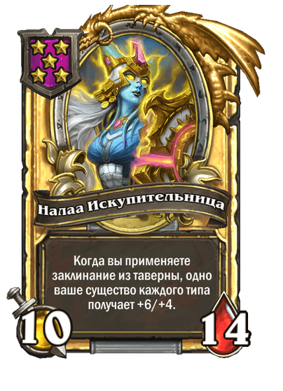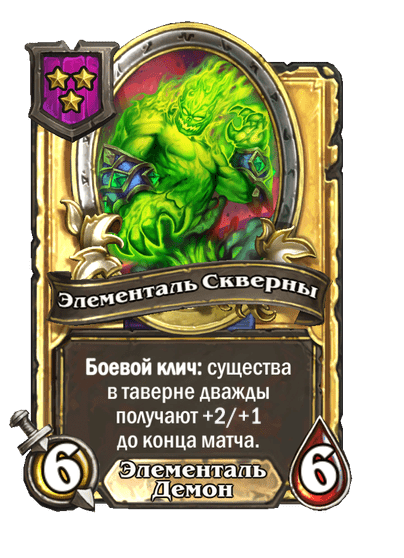 - До изменения: 5 атаки, 6 здоровья. Когда вы применяете заклинание из таверны, одно ваше существо каждого типа получает +2/+1.