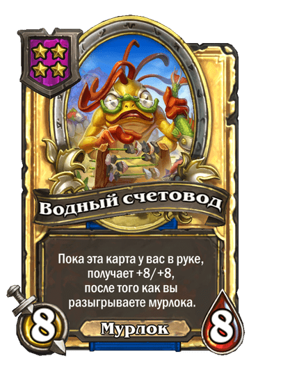 - До изменения: 4 атаки, 3 здоровья. Пока эта карта у вас в руке, получает +4/+3, после того как вы разыгрываете мурлока.