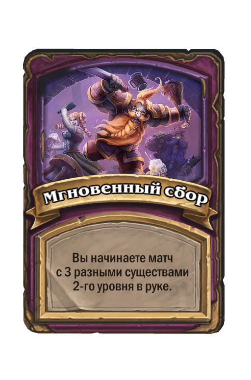 - До изменения: Боевой клич: существа в таверне получают +1/+1 до конца матча.