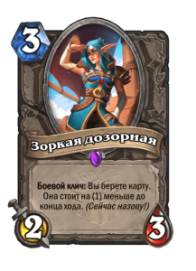 «Сейчас назову!» означает, что текст карты будет динамически изменяться во время матча, показывая вам, какую карту возьмет дозорная. Глаз у нее наметан! После обновления 33.2 оба существа будут выданы при получении комплекта «Затерянного города Ун’Горо». «Зоркая дозорная» покинет Стандарт вместе с дополнением «Затерянный город Ун’Горо».