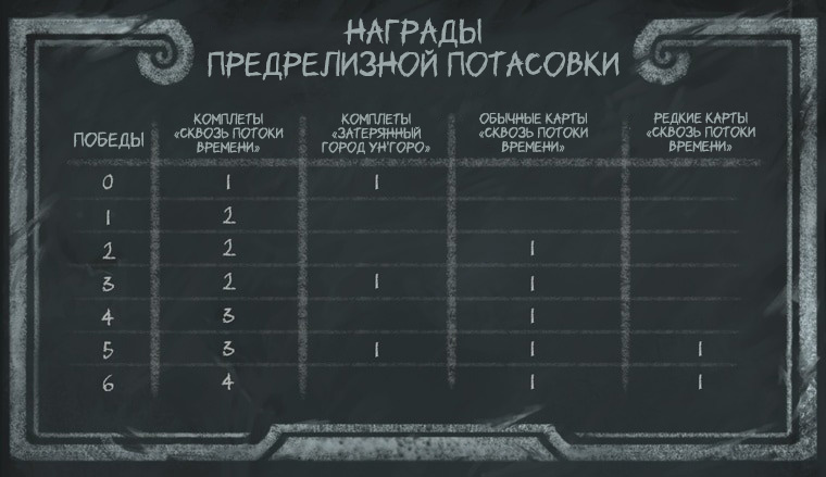 Все игроки получат 1 бесплатный пропуск в предрелизную потасовку. После этого каждое вступление будет стоить 2 пропуска в таверну, 300 золотых или 400 рунических камней. В каждой заявке вам предстоит собрать только 1 колоду и участвовать в матчах, пока вы не достигните 6 побед или 3 поражений. Количество побед определяет, какие призы вы получите.