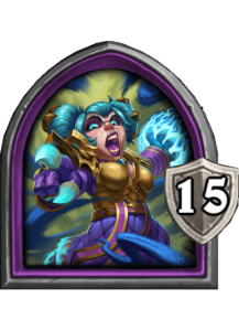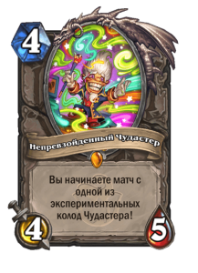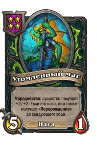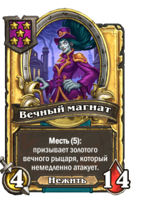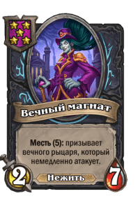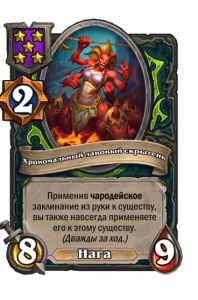 - [2 хронума] 8 атаки, 9 здоровья. Применив чародейское заклинание из руки к существу, вы также навсегда применяете его к этому существу. (Дважды за ход.)