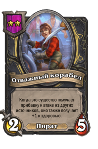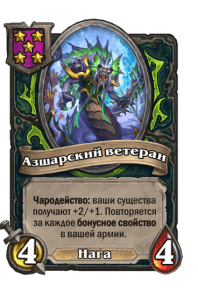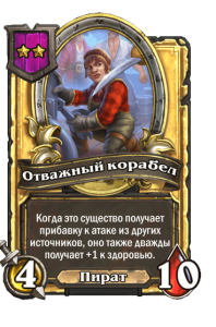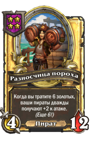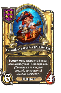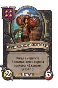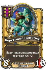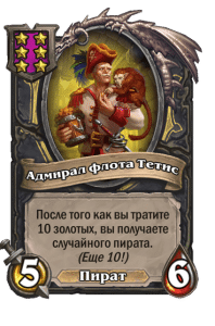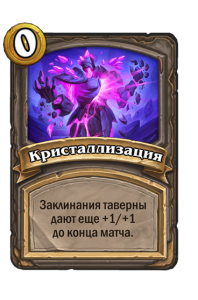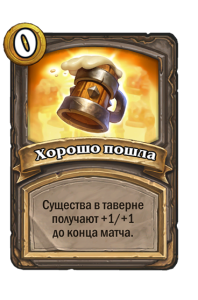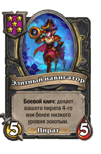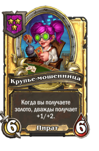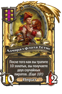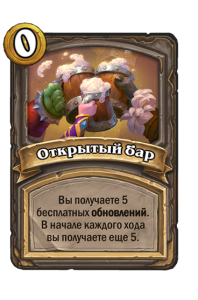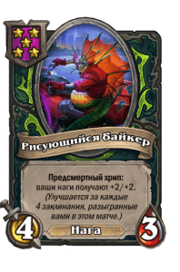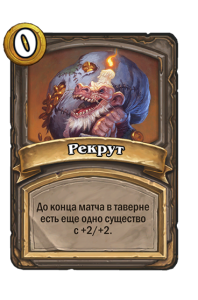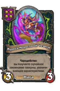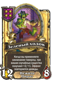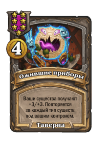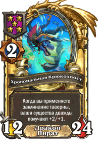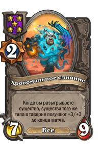 - [2 хронума] 7 атаки, 9 здоровья. Когда вы разыгрываете существо, существа того же типа в таверне получают +3/+3 до конца матча.