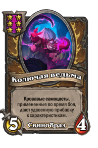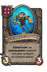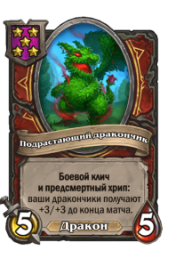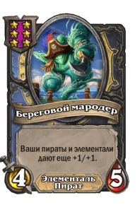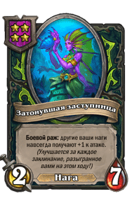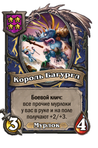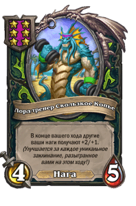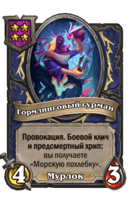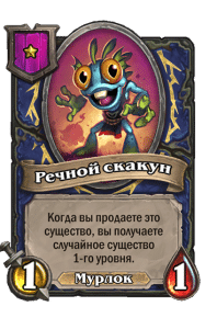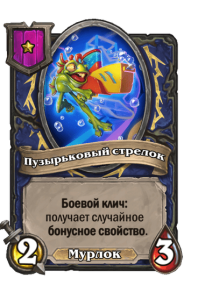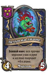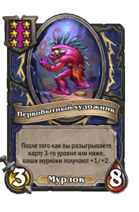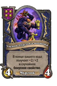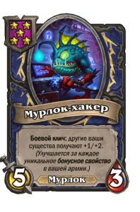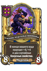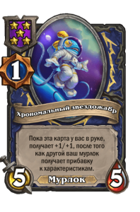 - [1 хронума] 5 атаки, 5 здоровья. Пока эта карта у вас в руке, получает +1/+1, после того как другой ваш мурлок получает прибавку к характеристикам.