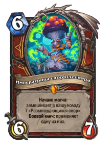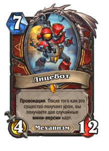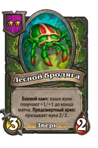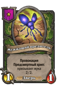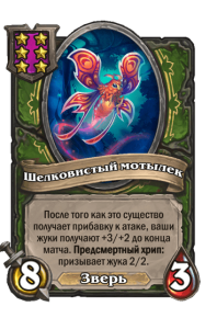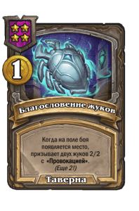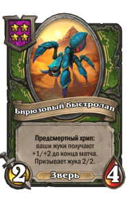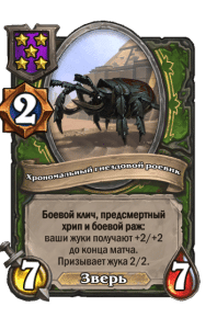 - [2 хронума] 7 атаки, 7 здоровья. Боевой клич, предсмертный хрип и боевой раж: ваши жуки получают +2/+2 до конца матча. Призывает жука 2/2.