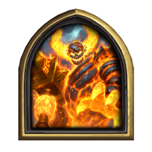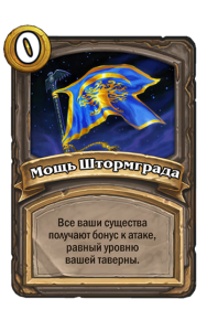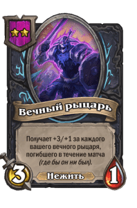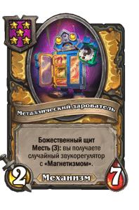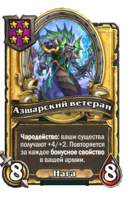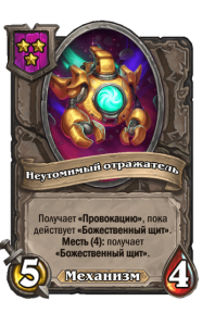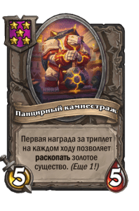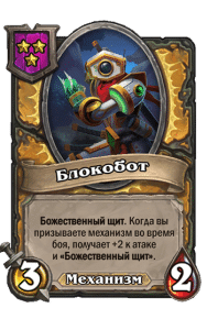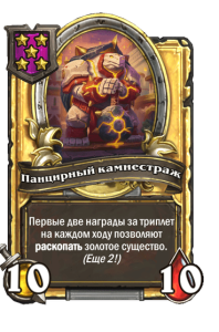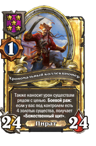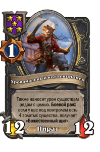 - [1 хронума] 12 атаки, 12 здоровья. Также наносит урон существам рядом с целью. Боевой раж: если у вас под контролем есть 4 золотых существа, получает «Божественный щит».