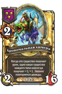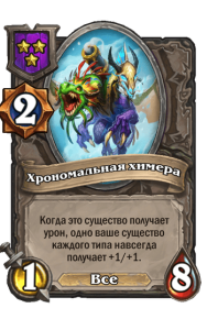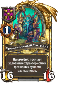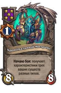 - [1 хронума] 8 атаки, 8 здоровья. Начало боя: получает характеристики трех ваших существ разных типов.