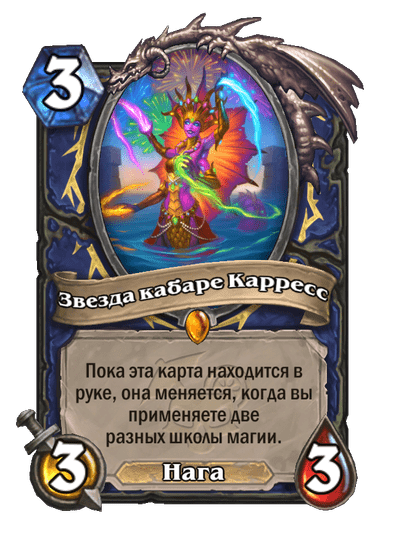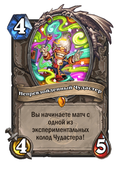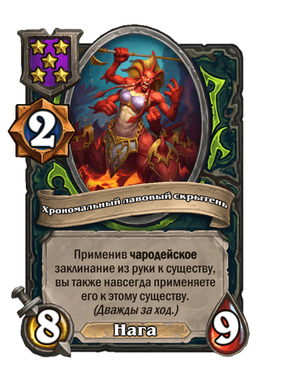 - [2 хронума] 8 атаки, 9 здоровья. Применив чародейское заклинание из руки к существу, вы также навсегда применяете его к этому существу. (Дважды за ход.)