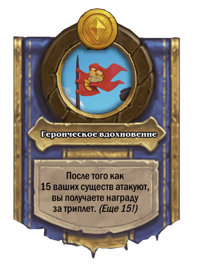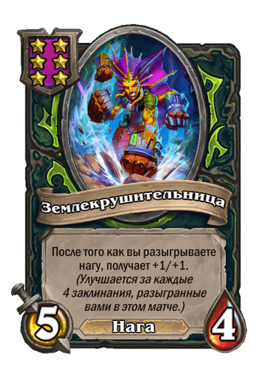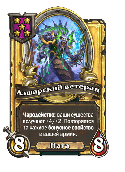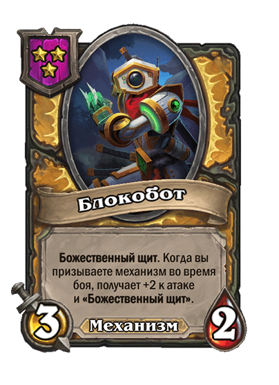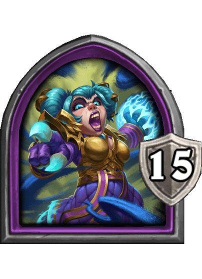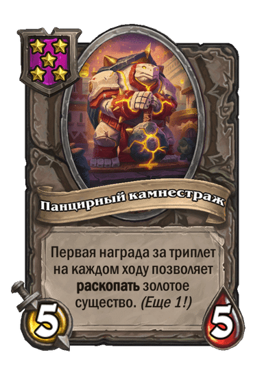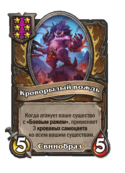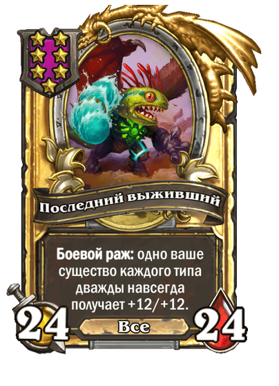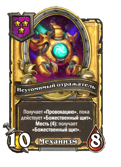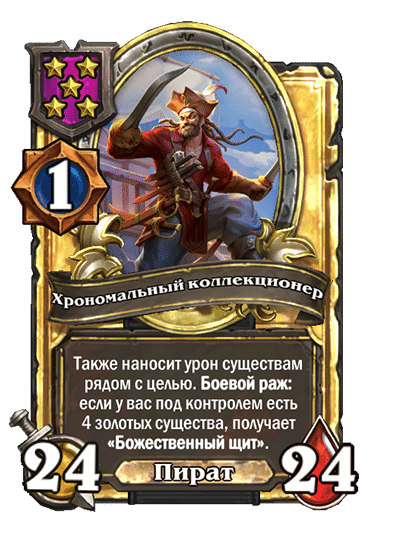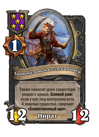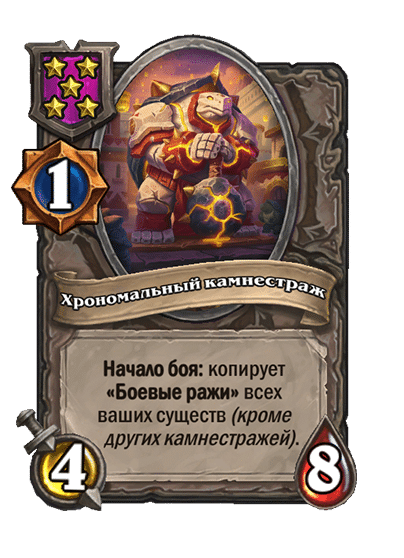 - [1 хронума] 12 атаки, 12 здоровья. Также наносит урон существам рядом с целью. Боевой раж: если у вас под контролем есть 4 золотых существа, получает «Божественный щит».