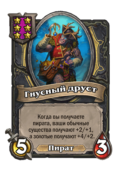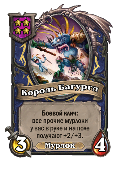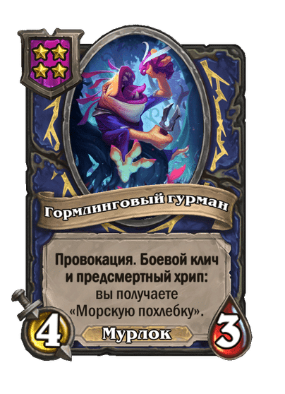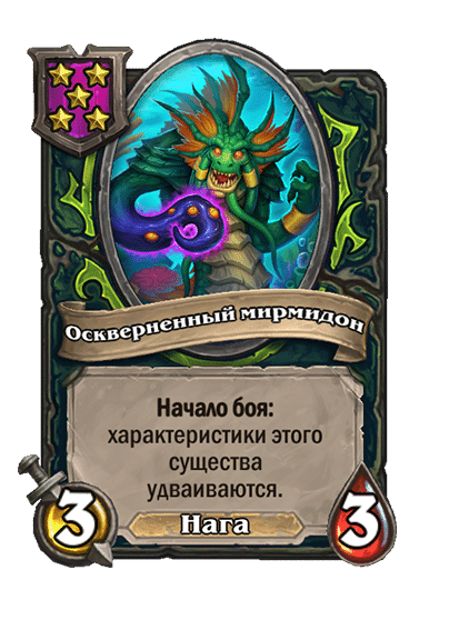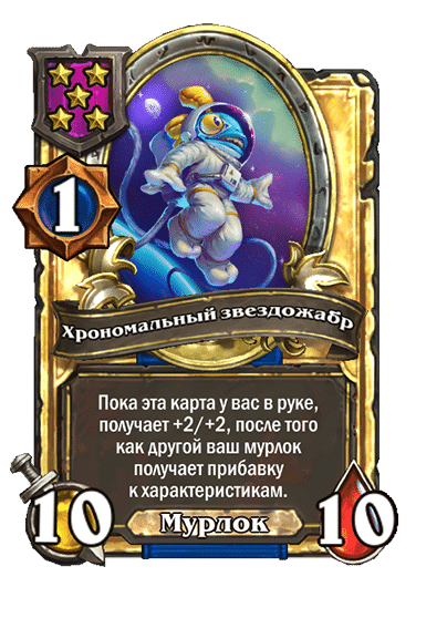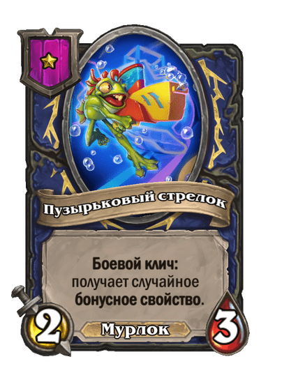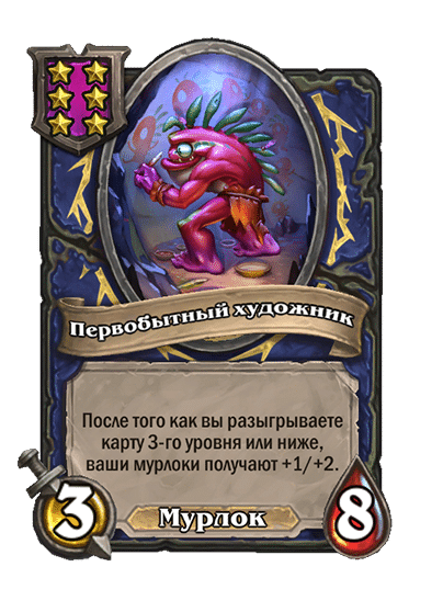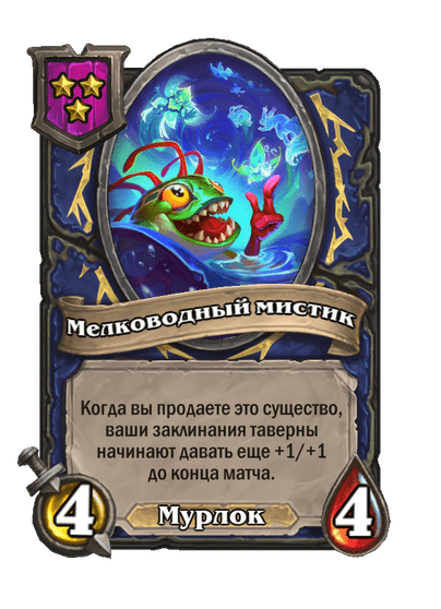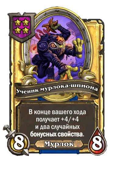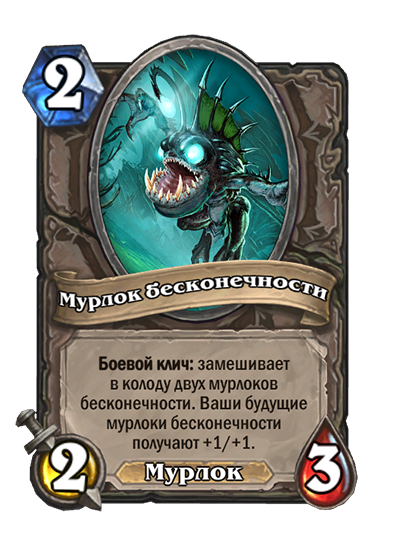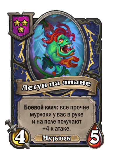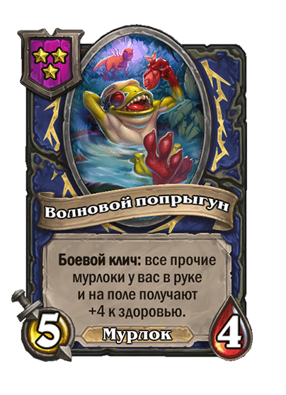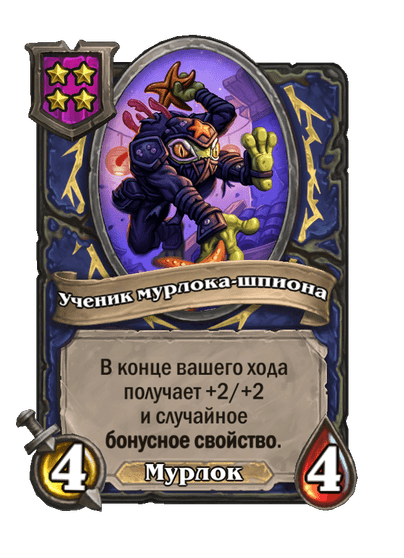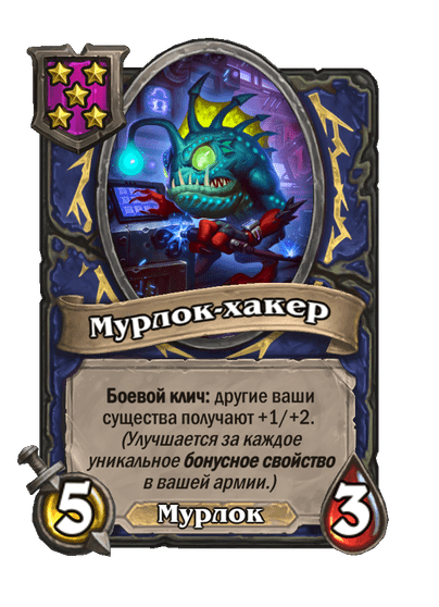 - [1 хронума] 5 атаки, 5 здоровья. Пока эта карта у вас в руке, получает +1/+1, после того как другой ваш мурлок получает прибавку к характеристикам.