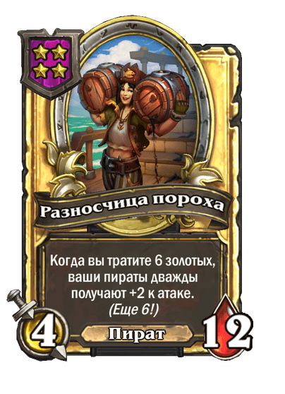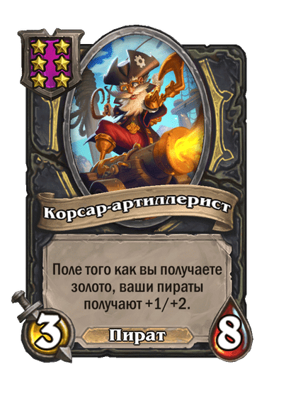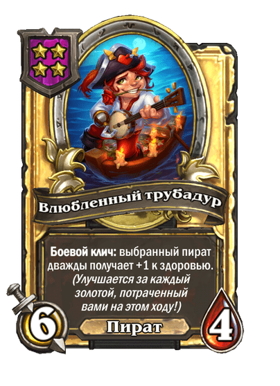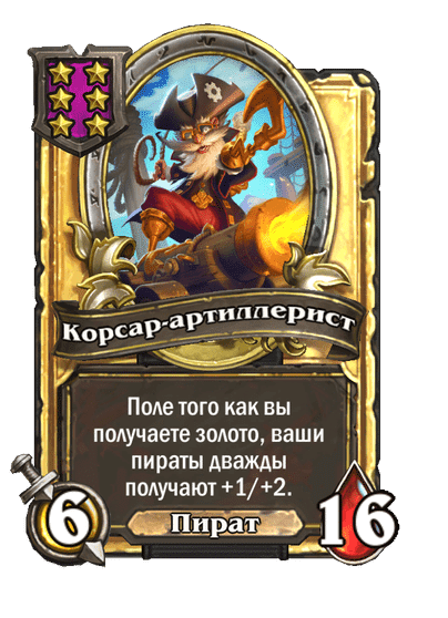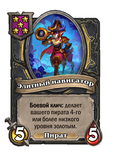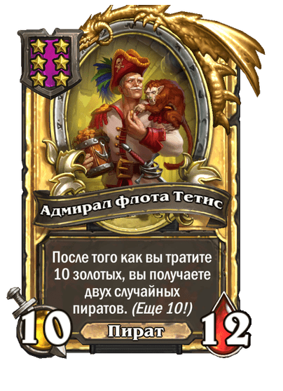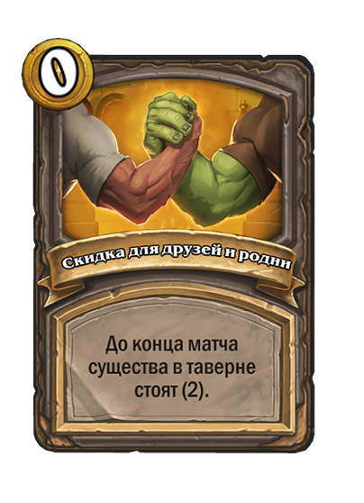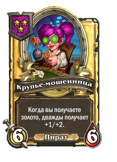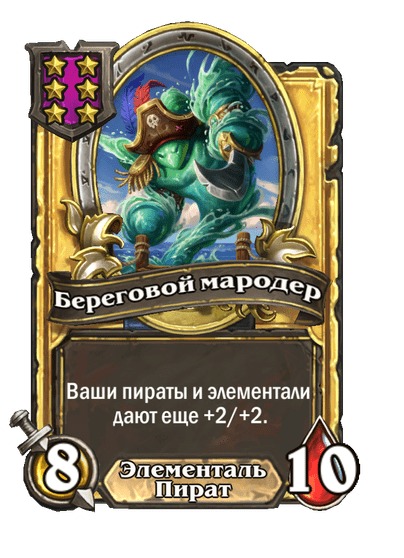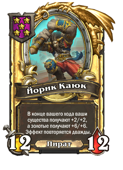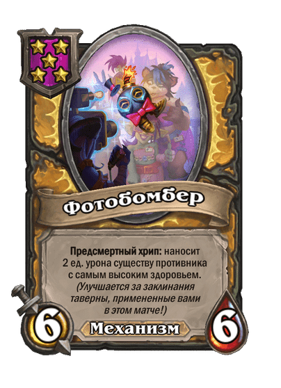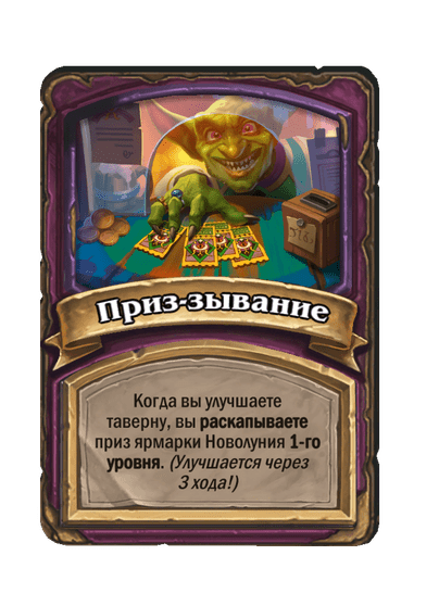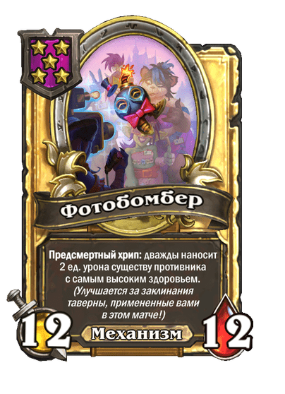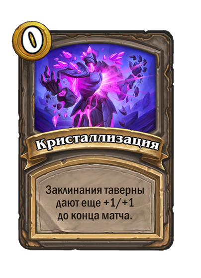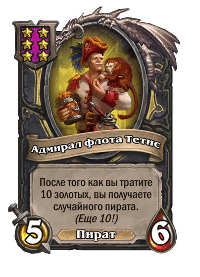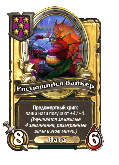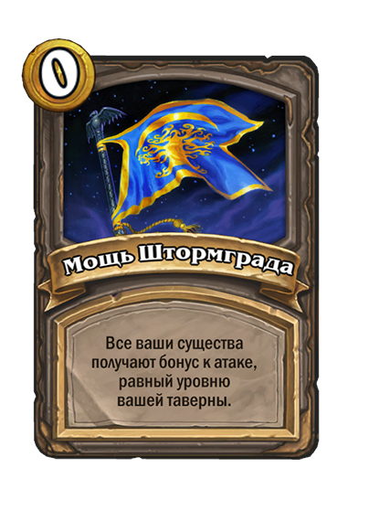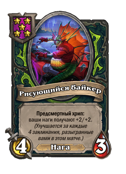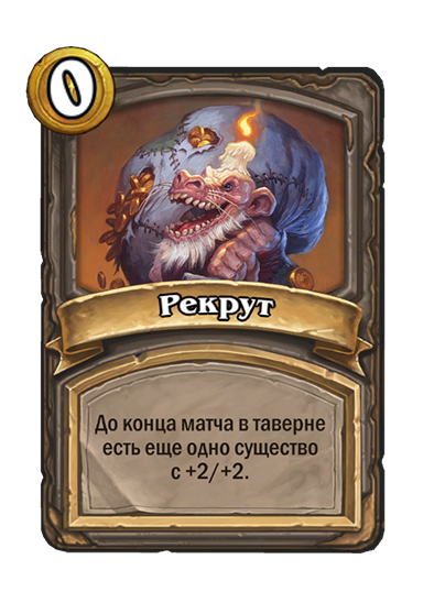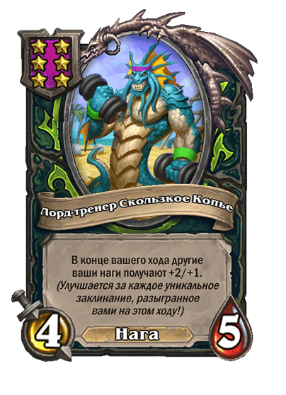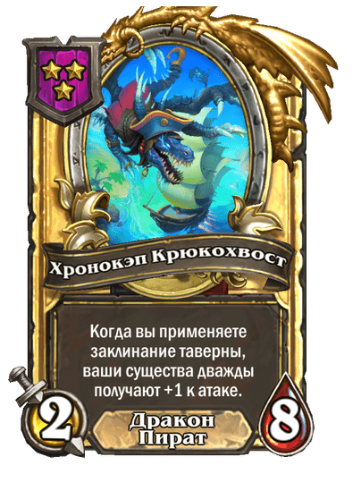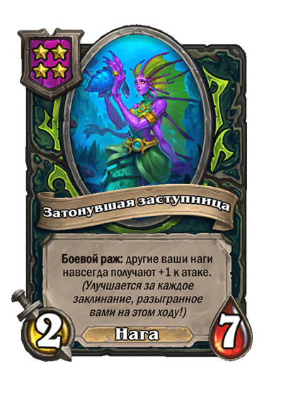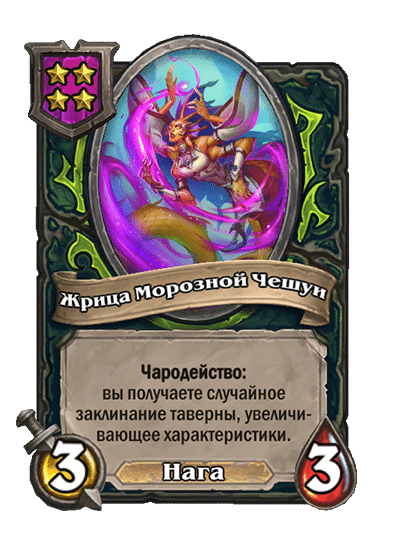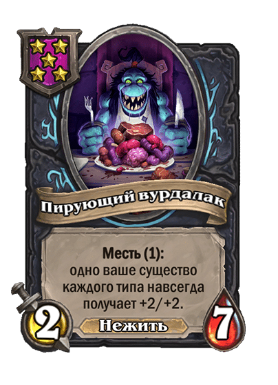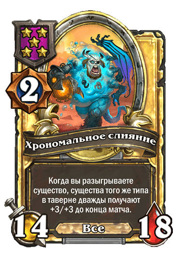 - [2 хронума] 7 атаки, 9 здоровья. Когда вы разыгрываете существо, существа того же типа в таверне получают +3/+3 до конца матча.