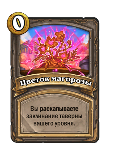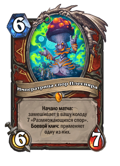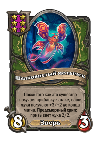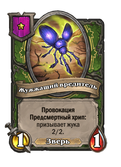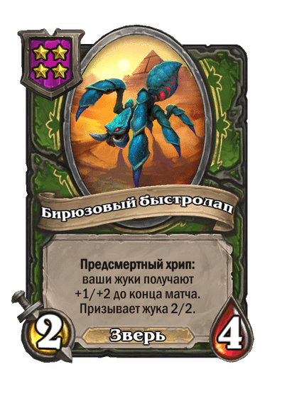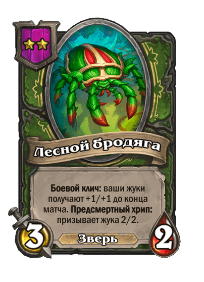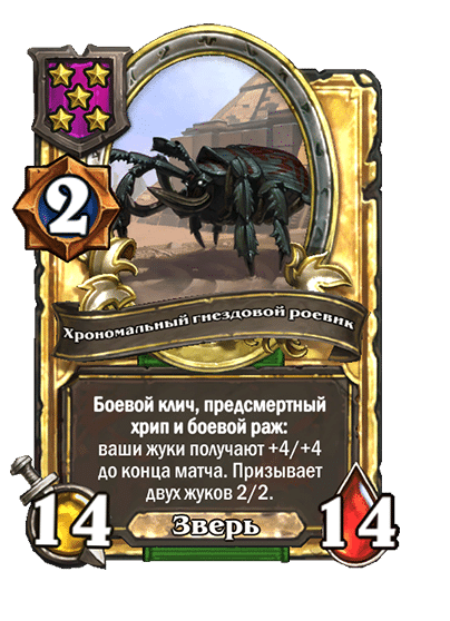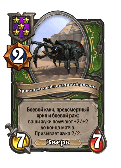 - [2 хронума] 7 атаки, 7 здоровья. Боевой клич, предсмертный хрип и боевой раж: ваши жуки получают +2/+2 до конца матча. Призывает жука 2/2.
