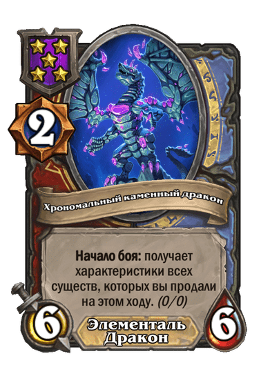 - [2 хронума] 6 атаки, 6 здоровья. Начало боя: получает характеристики всех существ, которых вы продали на этом ходу.