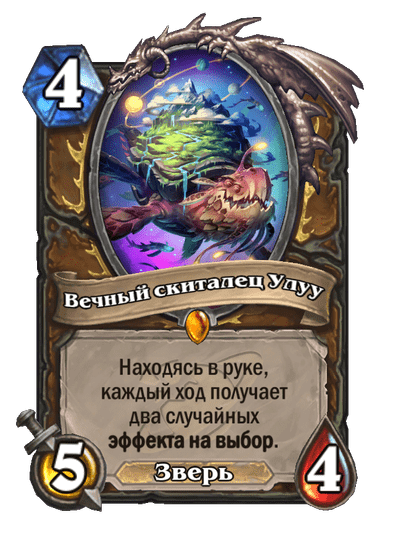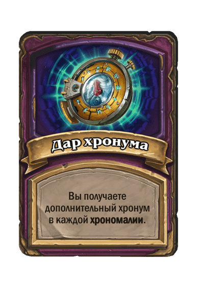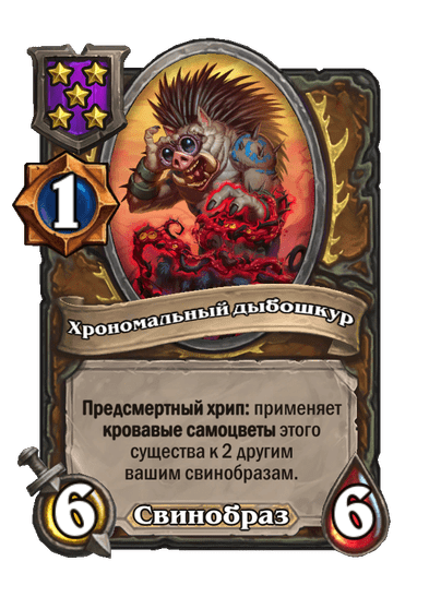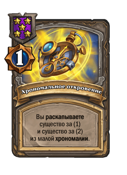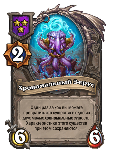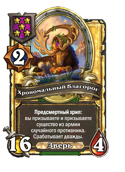 - [2 хронума] 4 атаки, 5 здоровья. Месть (5): вы получаете случайную карту за (1) из малой хрономалии.