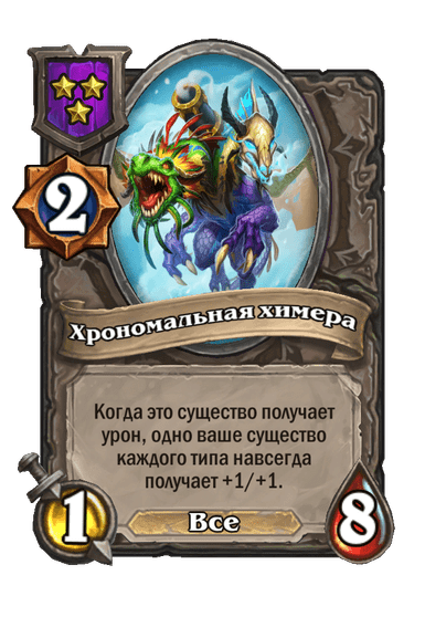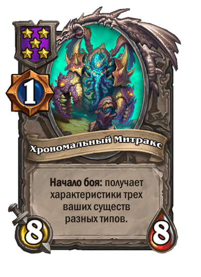 - [1 хронума] 8 атаки, 8 здоровья. Начало боя: получает характеристики трех ваших существ разных типов.