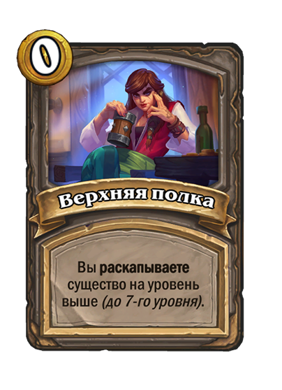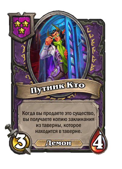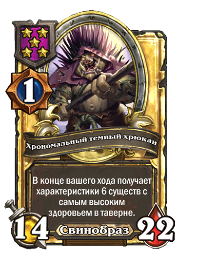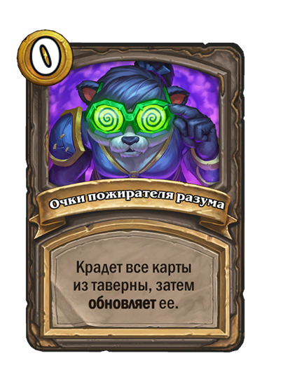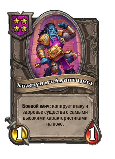 - [1 хронума] 7 атаки, 11 здоровья. В конце вашего хода получает характеристики 3 существ с самым высоким здоровьем в таверне.