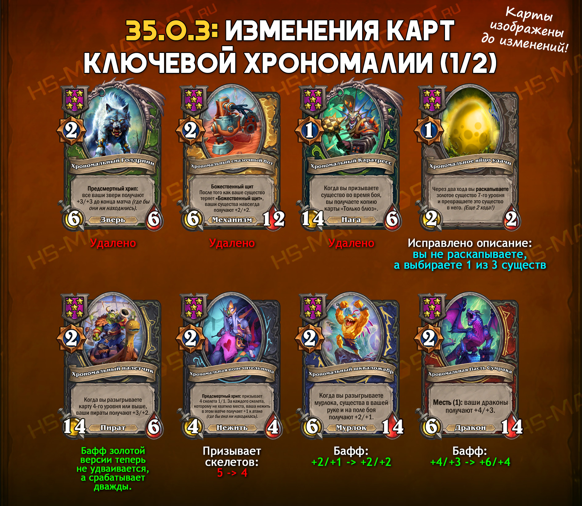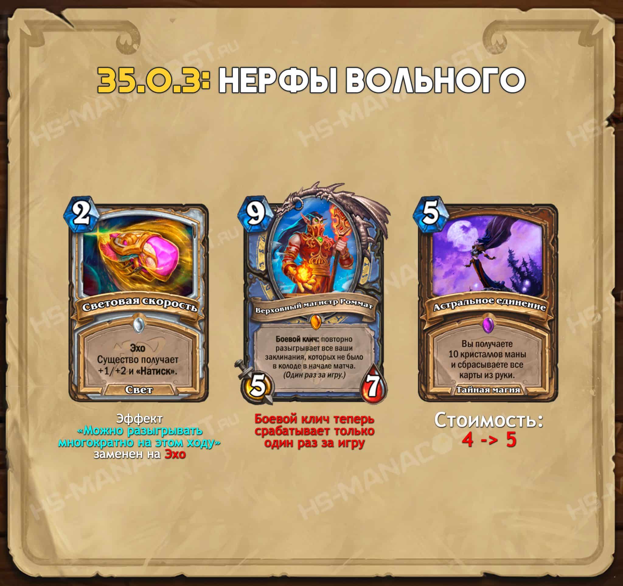 Все вышеперечисленные ослабленные карты, которые можно создать из чародейной пыли, будут доступны для распыления за полную стоимость в течение двух недель после выхода обновления 35.0.3. Вы можете найти их в коллекции по слову «возврат» (для вольных карт нужно включить вольные наборы).