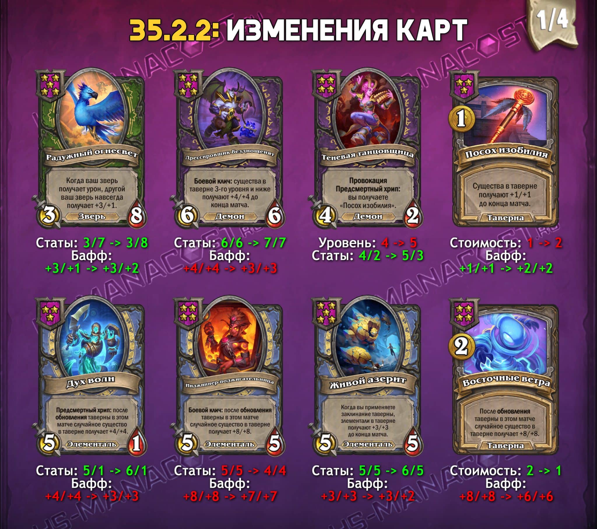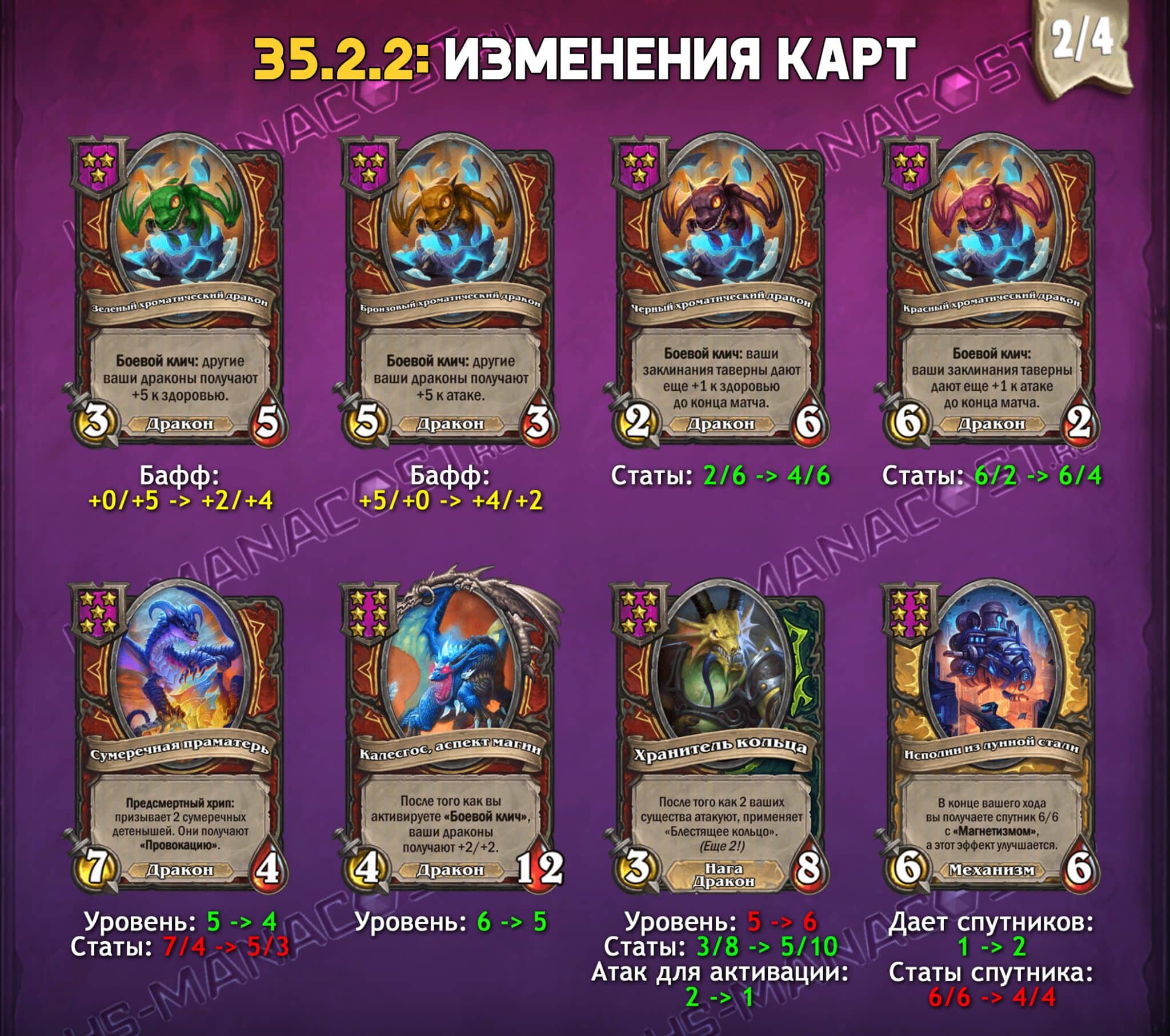 Комментарий разработчиков: Надеемся, вы хорошо проводите время в новом сезоне. Это обновление в первую очередь призвано сгладить показатели некоторых неэффективных или слишком эффективных карт. Большинство изменений существ нацелено на отдельные выбивающиеся карты, но мы также пользуемся возможностью, чтобы усилить драконов и нежить и ослабить элементалей.