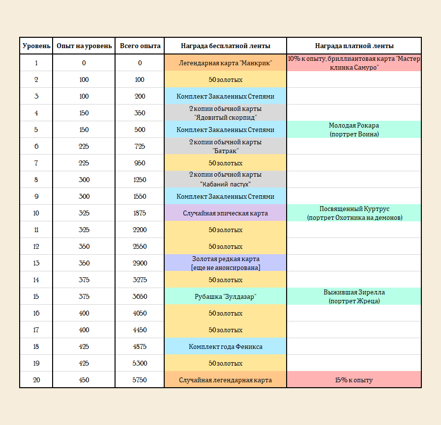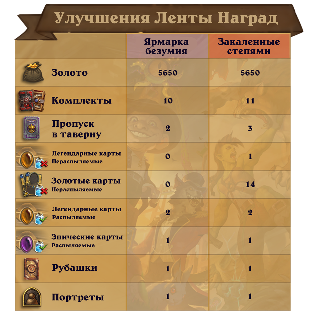 На ленте наград дополнения «Закаленные Степями» будут представлены комплекты карт дополнений стандартного формата, рубашка «Зулдазар», пропуски в таверну, случайная эпическая карта, две случайные легендарные карты и уйма золота. За полное прохождение ленты вы сможете выбрать один из 10 обликов героев с предыдущей ленты наград. Также вас ждет 14 золотых карт, которые нельзя создать, и легендарное существо Манкрик — он станет первой наградой на новой ленте!