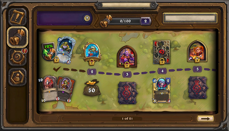 На бесплатной ленте наград «Убийства в замке Нафрия» будут представлены комплекты карт «Убийства в замке Нафрия», стандартные комплекты, пропуски в таверну, случайная эпическая карта, две случайные легендарные карты, карта эпического наемника Сэра Финли, рубашка «Ревендрет» и уйма золота! Кроме того, вы сможете получить 14 золотых карт и Сира Денатрия — легендарное существо из нового дополнения.* За полное прохождение ленты вы сможете выбрать один из 10 ранее выпущенных обликов героев.