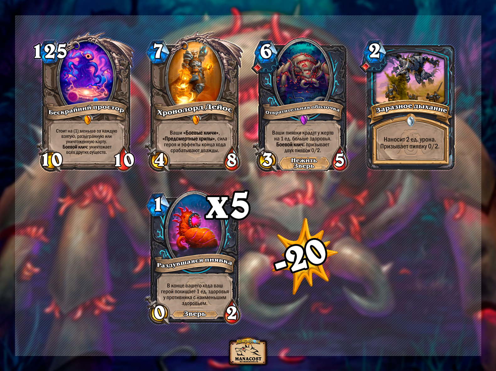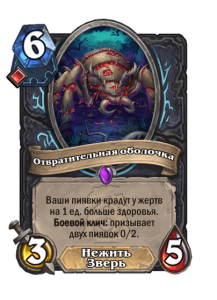 В колоде также есть уже привычные пиявки — в первую очередь сильнейшая Отвратительная оболочка. И вот тут то и кроется главное отличие сборки с Дейосом от классических сборок. Отвратительная оболочка потрясающе сочетается с этой легендаркой. Мало того, что вы призываете не 2 пиявки, а 4, так еще и каждая из них высасывает здоровье дважды. Таким образом, за 13 маны вы можете получить 16 ед. здоровья и либо зачистить стол, либо сильно покалечить противника. Второй вариант, конечно, более предпочтительный, поэтому авторы сборки предлагают сохранять для комбинации еще и Бескрайний простор. Если же дожить до 15 маны (благодаря Изере), то можно добавить в комбинацию Заразное дыхание и высосать 20 хп.
