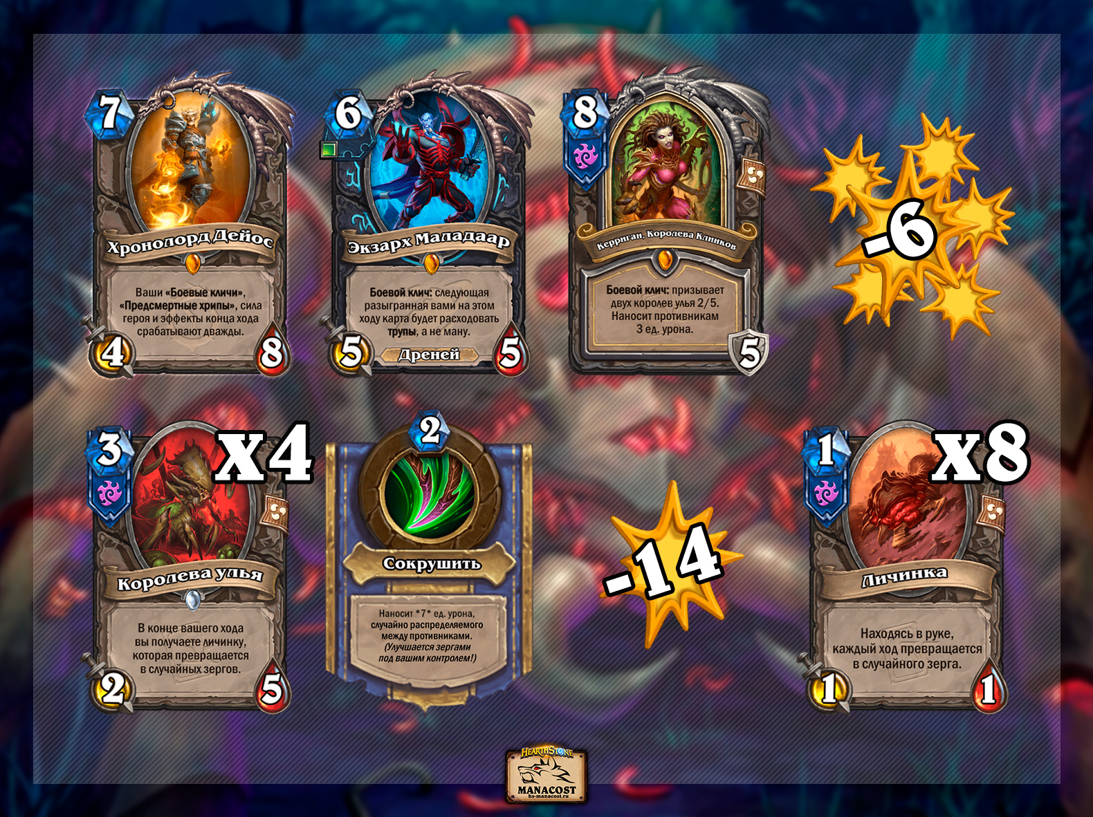 Здесь также есть одна карта, которую обычно ДК не играет — Керриган Королева Клинков. С ней тоже можно провернуть комбинацию, но уже посложнее. Для этого понадобится еще и Экзарх Маладаар, чтобы из 15 маны вы потратили только 13, а 2 остались бы на силу героя. Тогда Керриган нанесет 6 ед. АоЕ-урона — часто это полная зачистка — и призовет четырех Королев улья. Абилка при этом будет наносить 7 ед. урона, а благодаря Дейосу — все 14. Не забудьте про 8 зергов в руке в конце хода.