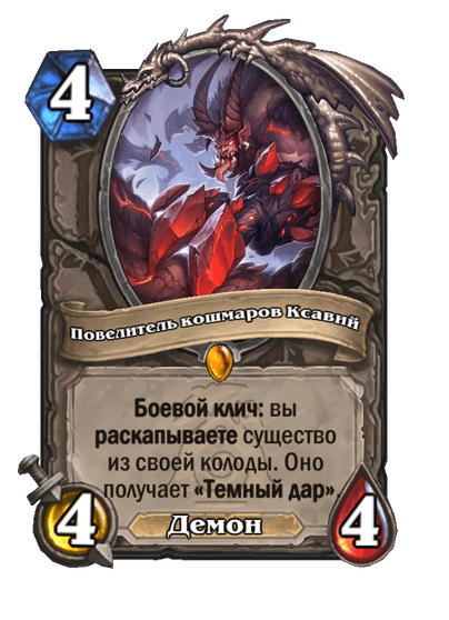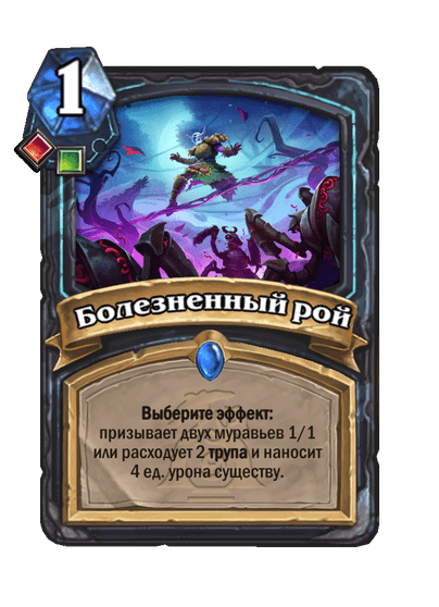 В основе сборки лежит уже привычный набор карт. Порождение безумия дает колоде возможность для агрессивного старта. Болезненный рой и Укротитель гончих позволяют быстро набрать трупы и тоже помогают со столом в начале партии. В наборе трупов также помогает Сгусток смолы, у которого к тому же есть хороший защитный потенциал. Реализовывает трупы в первую очередь Экзарх Маладаар с любым тяжелым дропом, а также Игрушечный потрошитель и Воскрешенный терродактиль.