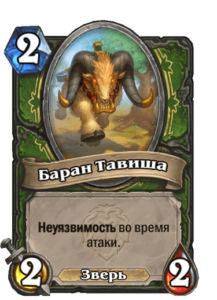 Не только баффнутое существо неуязвимо во время атаки, но и Баран Тавиша, который появится после смерти баффнутого существа. Неуязвимость на свой ход — хорошая опция в темповых матч-апах, хотя немного смущает стоимость заклинания в 3 маны. Возможно, для Охотника это слишком много.
