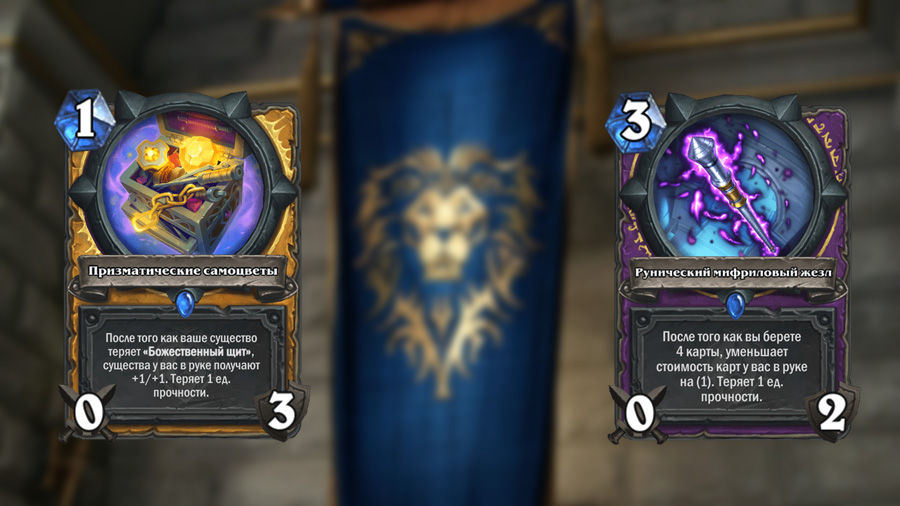Призматические самоцветы стоит всего лишь 1 маны, что обнадеживает. Скорее всего, вокруг этого оружия придется выстраивать колоду — в ней должно быть много божественных щитов, хороших целей для баффов и добора.