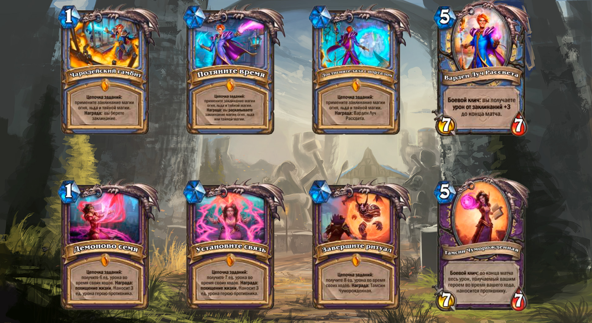Демоново семя — выполнить этот квест должно быть проще, потому что наносить себе урон Чернокнижник умеет. Помогает хотя бы сила героя, но есть и много эффектов на картах.