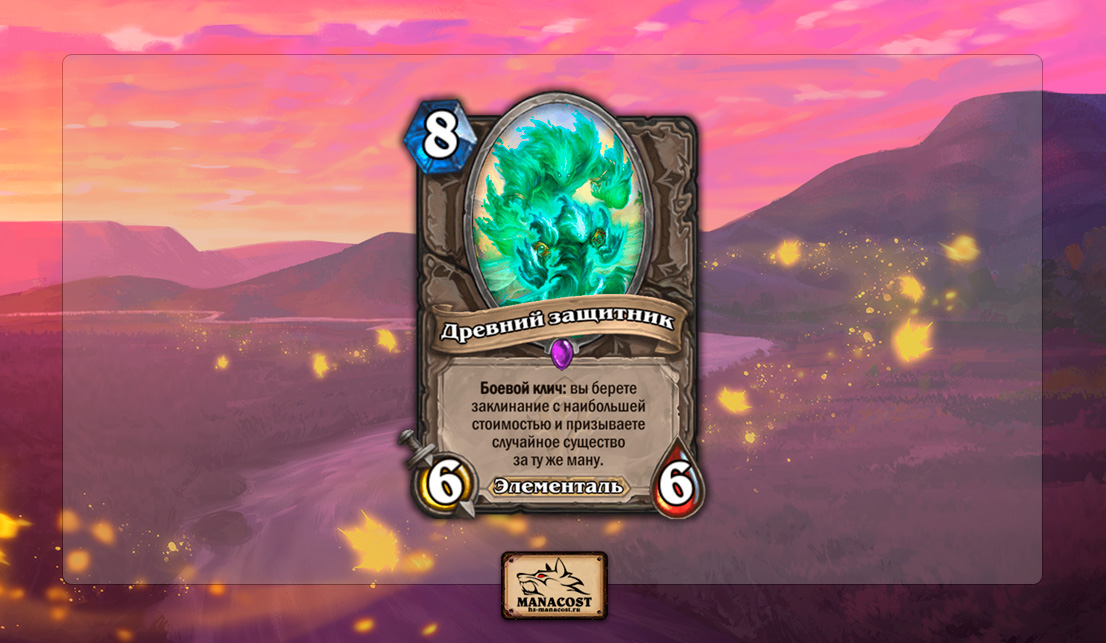 Похоже, Злая призывательница обучилась призыву элементалей и нашла себе преемника. Древний защитник потребует от вас лишней маны, но зато вдобавок к призыву доберет вам карту и гарантирует, что она не будет дешевой. Последняя особенность позволит класть в колоду любые заклинания, которые вы посчитаете нужными, помимо целевого.