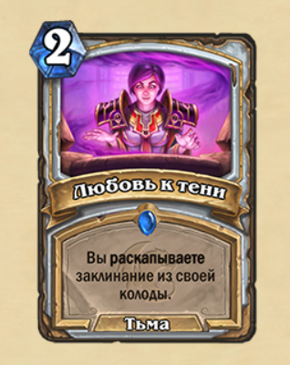 Напоминает Темные видения — одно из самых сильных заклинаний Жреца в истории игры. Но Любовь к тени не так сильна, потому что раскапывает саму карту, а не ее копию. К тому же вместе с заклинанием в Стандарте не будет Сияющего элементаля — он отлично работал с Темными видениями.