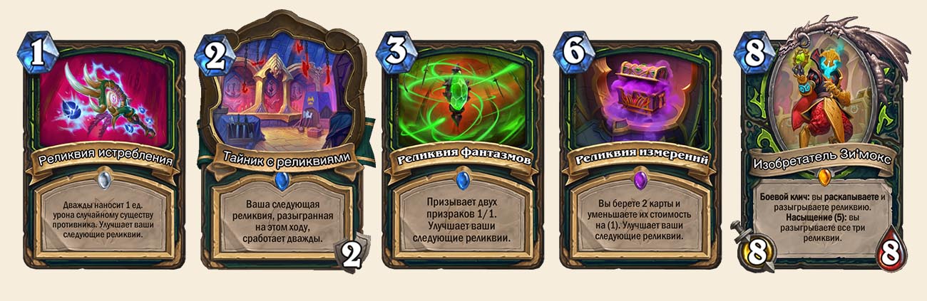[tape-deck id=243904]Как и в прошлом дополнении, Релик ДХ полагается на синергии реликвий — Реликвию истребления, Тайник с реликвиями, Реликвию фантазмов, Реликвию измерений и Изобретателя Зимокса. Этот набор обеспечивает Охотника на демонов всем необходимым — зачистками, генерацией статов, добором колоды. С помощью Реликвий Охотник на демонов чаще всего будет побеждать в партиях или по крайней мере проворачивать самые сильные ходы. Обычно Тайник с реликвиями ДХ держит для розыгрыша тяжелых реликвий за 3 и 6 маны, а Реликвию истребления использует для разгона других других реликвий.